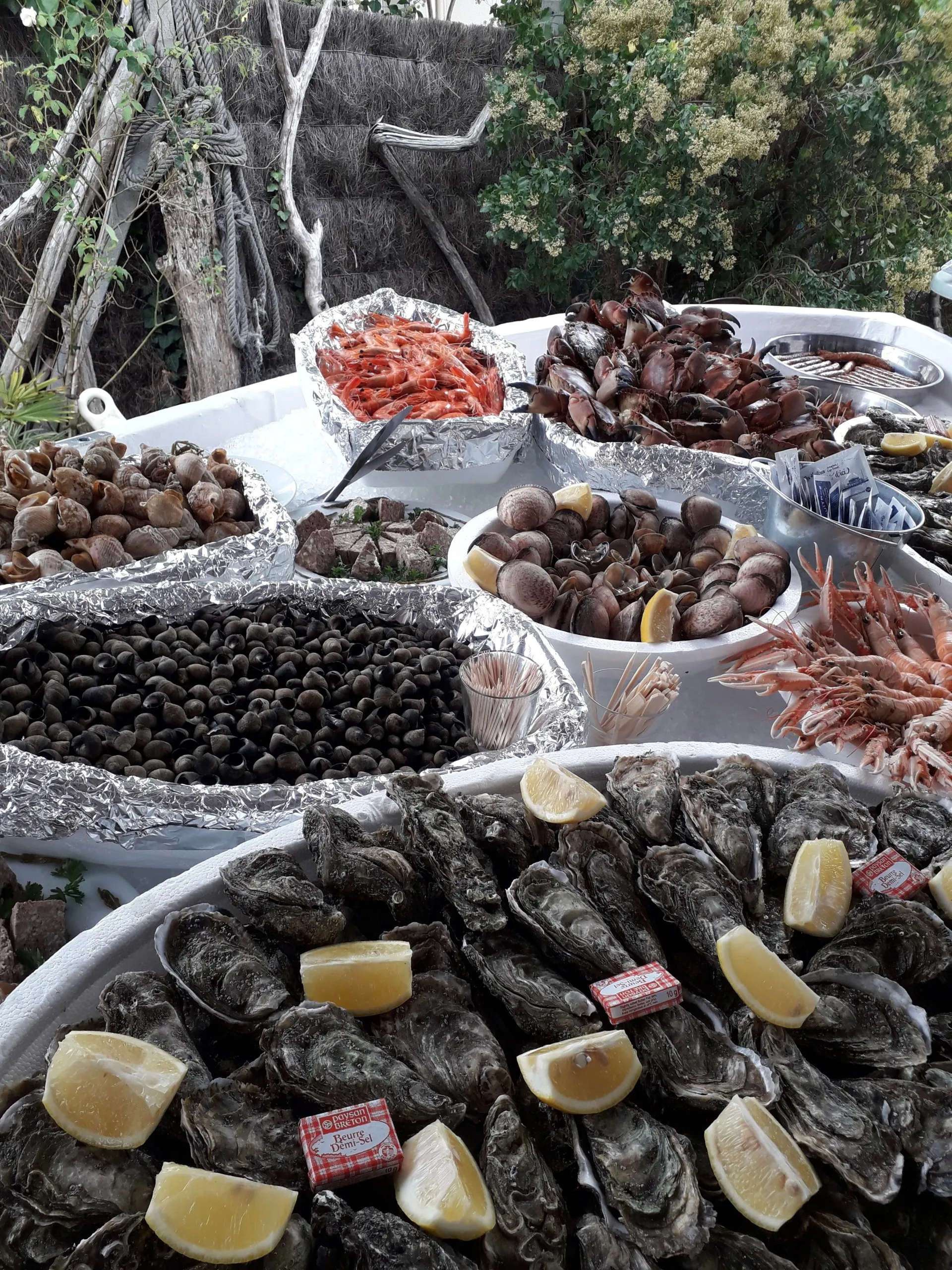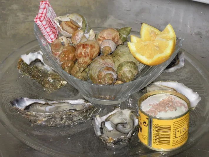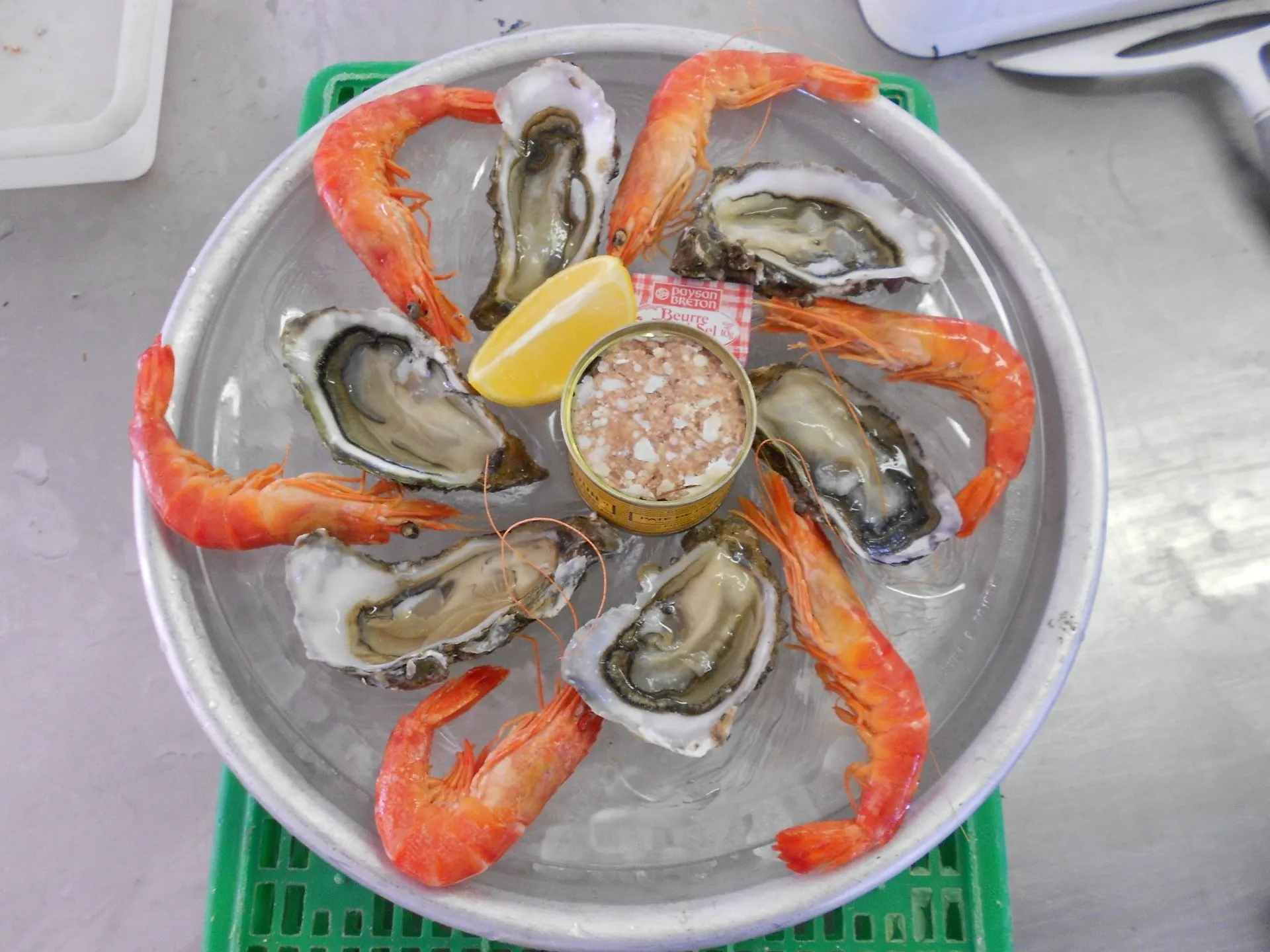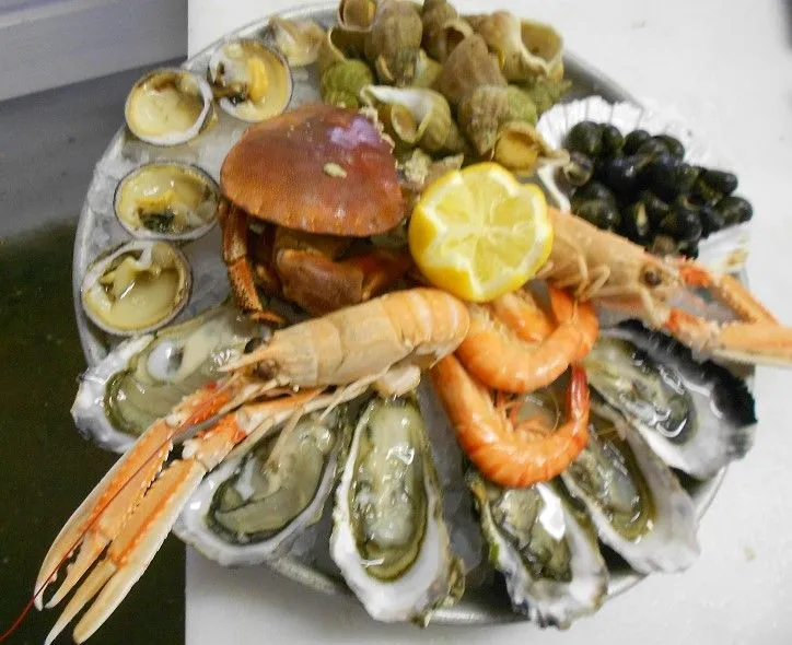 12 huîtres n° 3 + 2 amandes + 2 palourdes + 4 crevettes + 2 langoustines + bigorneaux + bulots + 1 tourteau portion + 1 mayonnaise ou aïoli, citron - beurre