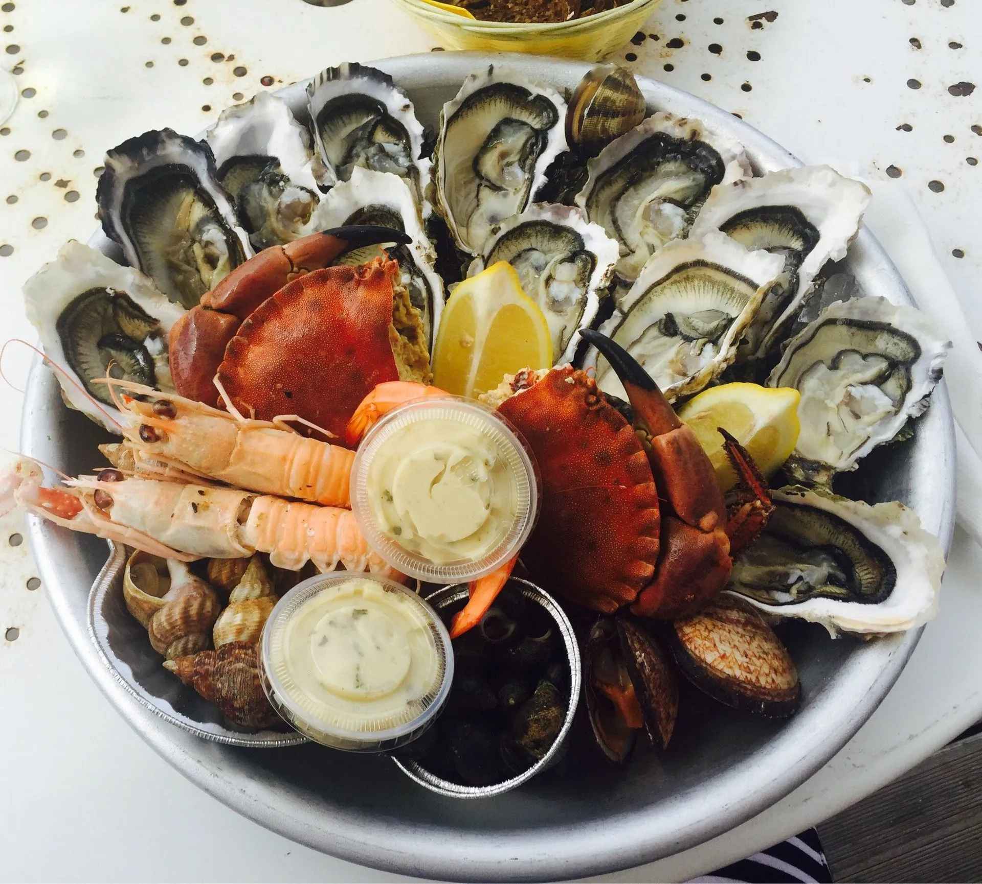 6 huîtres n° 3 + 2 amandes + 2 palourdes + 3 crevettes + 2 langoustines + bigorneaux + bulots + ½ tourteau + 1 coupelle mayonnaise ou aïoli, citron - beurre